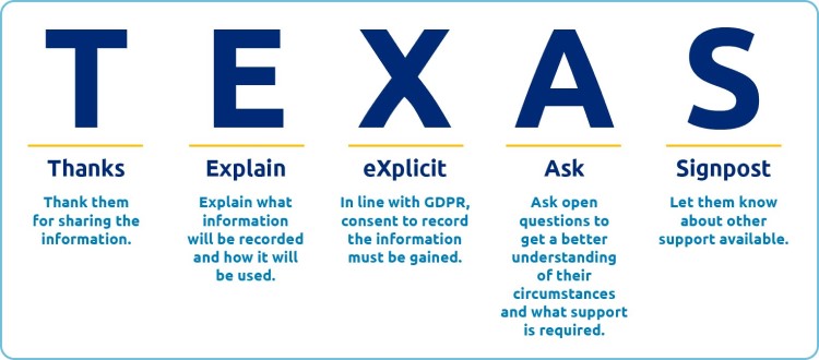 When we identify a vulnerable customer our people use ‘TEXAS’ which is a recognised tool that can be used to record information respectfully and compliantly – which we’ve shown below should this be helpful for your own purposes.